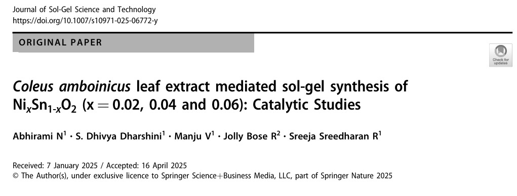 Congratulations for new publication 21Aug, 2025 Congratulations, to Dr. Sreeja and Dr. Manju for their new journal article. Abhirami and Dhivyadarshini were PG students of the Physics Department. Their MSc project publised as a research article. Previous Selection for Kerala Rugby Team August 19, 2025 Next Congratulations Dr. Manju V. for the new publications August 21, 2025
