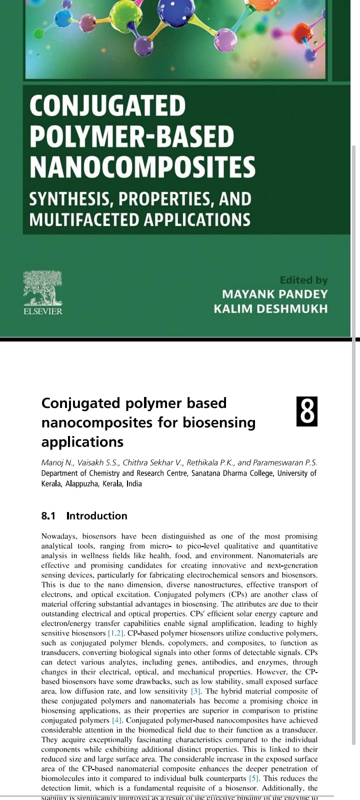 The Department of Chemistry, Santana Dharma College is happy to share that one of the chapters in the ELSEVIER book “CONJUGATED POLYMER BASED -NANOCOMPOSITES SYNTHESIS, PROPERTIES AND MULTIFACETED APPLICATIONS” is contributed by our faculty members. Chapter 8, titled “Conjugated polymer based nanocomposites for biosensing applications,” is authored by Dr. Manoj N (Assistant Professor), Dr. Vaisakh S. S. (Assistant Professor), Dr. Chithra Sekhar V (Assistant Professor), Dr. Rethikala P. K (Assistant Professor), and Dr. P. S. Parameswaran (Professor). The book is edited by Mayank Pandey and Kalim Desmukh. This chapter publication adds to the academic and research achievements of the department.